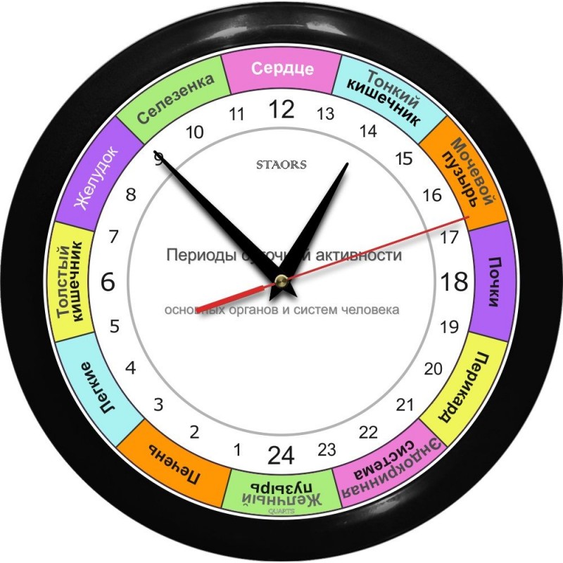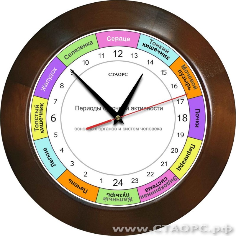 Для этого, на циферблате (круге часов) имеются соответствующие сектора - с названием органа.