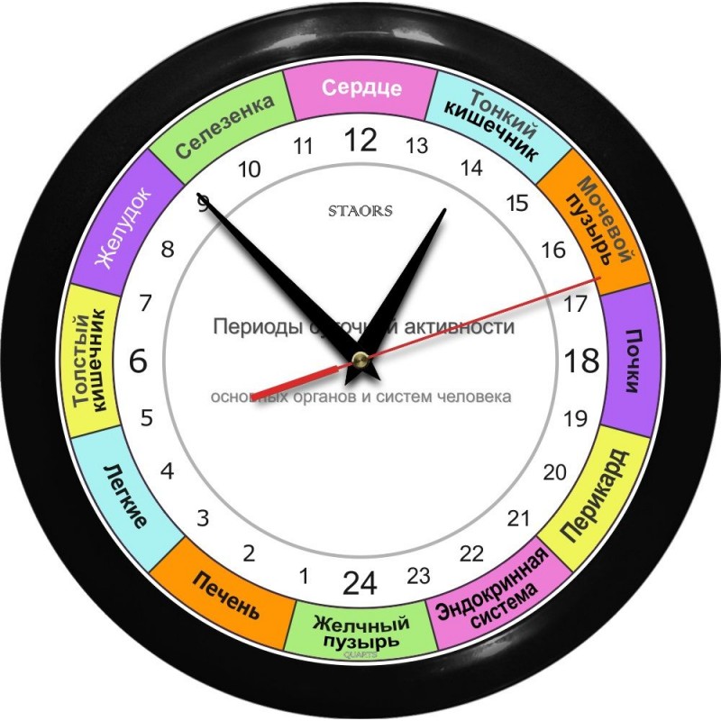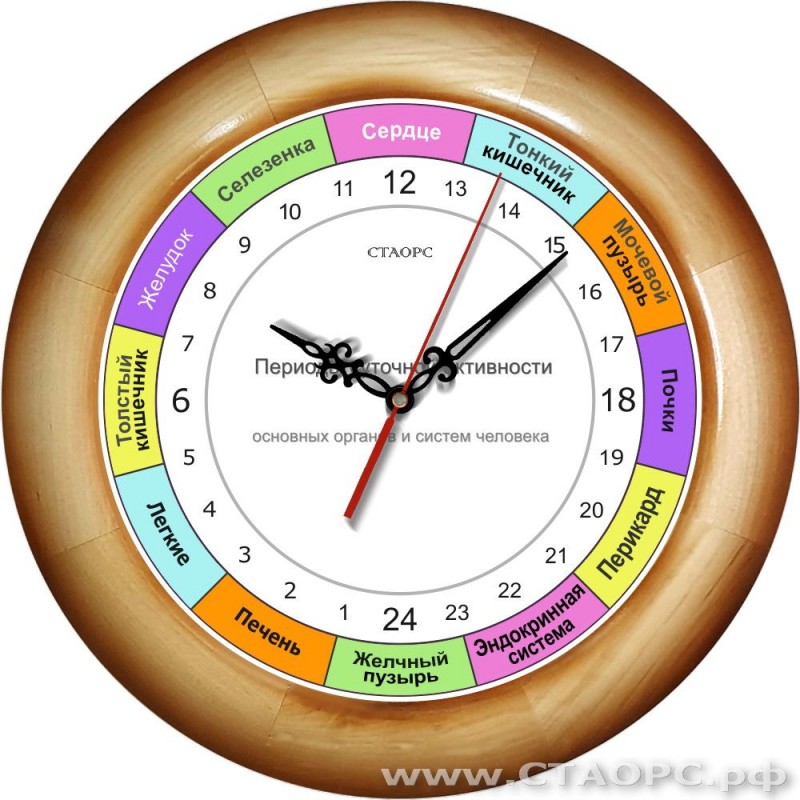 Для этого, на циферблате (круге часов) имеются соответствующие сектора - с названием органа.